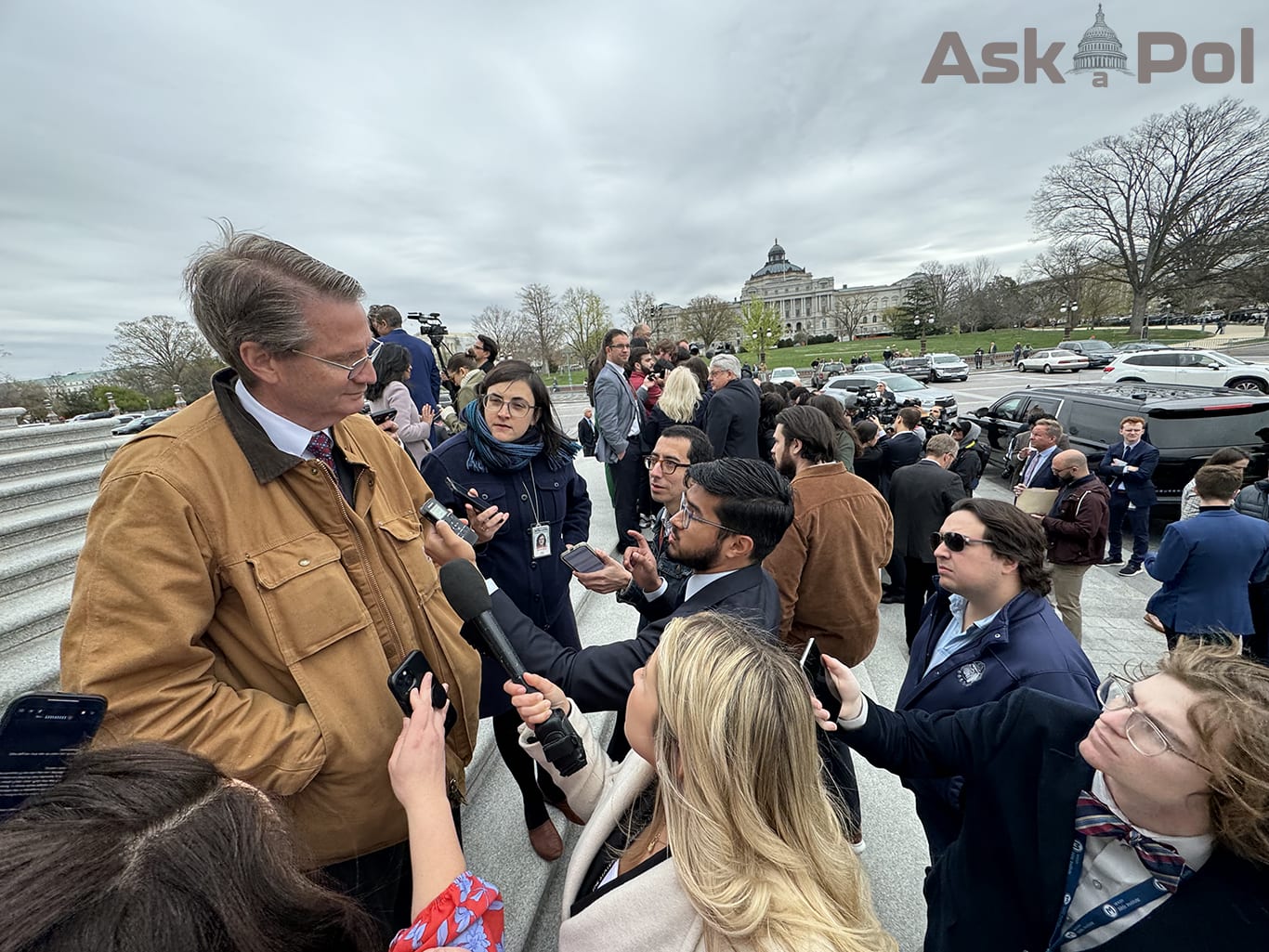 Man in red tie and light brown work jacket takes questions from reporters on US Capitol steps. Photo: Matt Laslo for © www.askapol.com