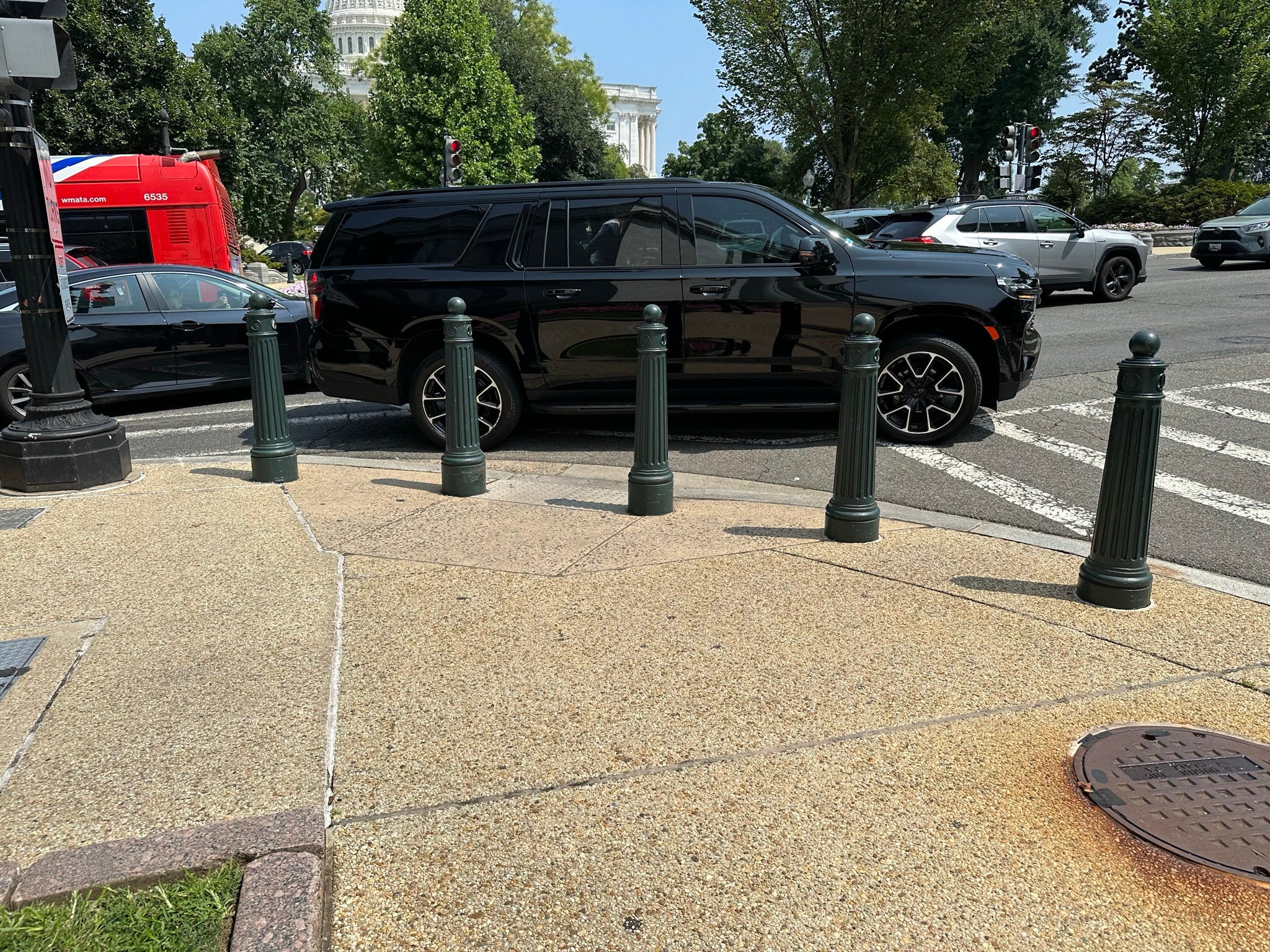 Comer turns to his staffer as he points to a big Black SUV idling.