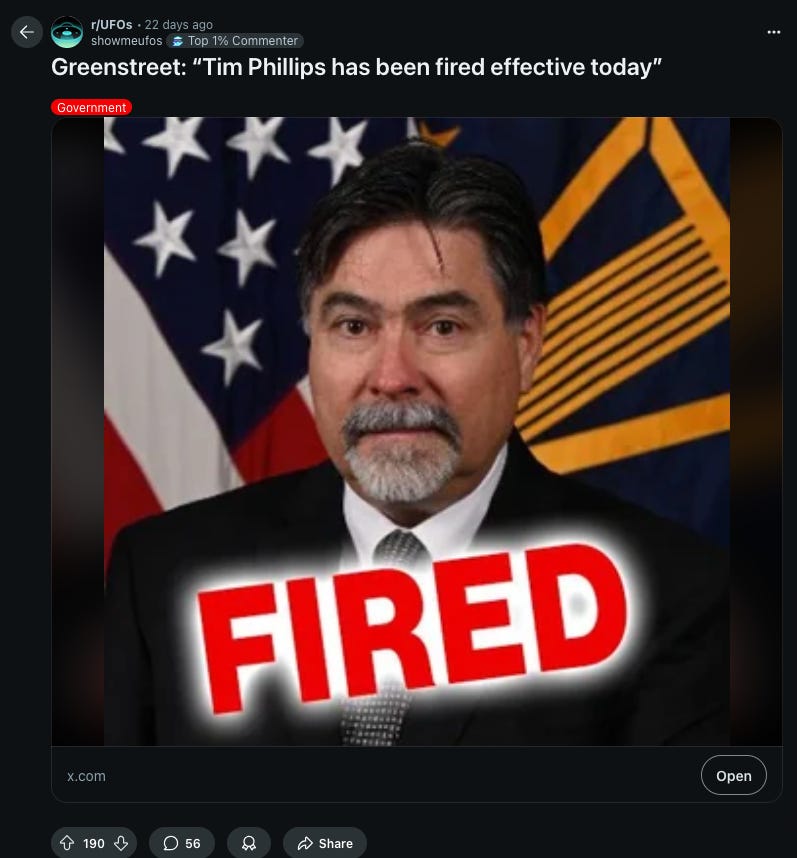 Matt Laslo: “Did you hear about this firing of Tim Phillips by ODNI [Office of Director of National Intelligence]? The former AARO guy?”