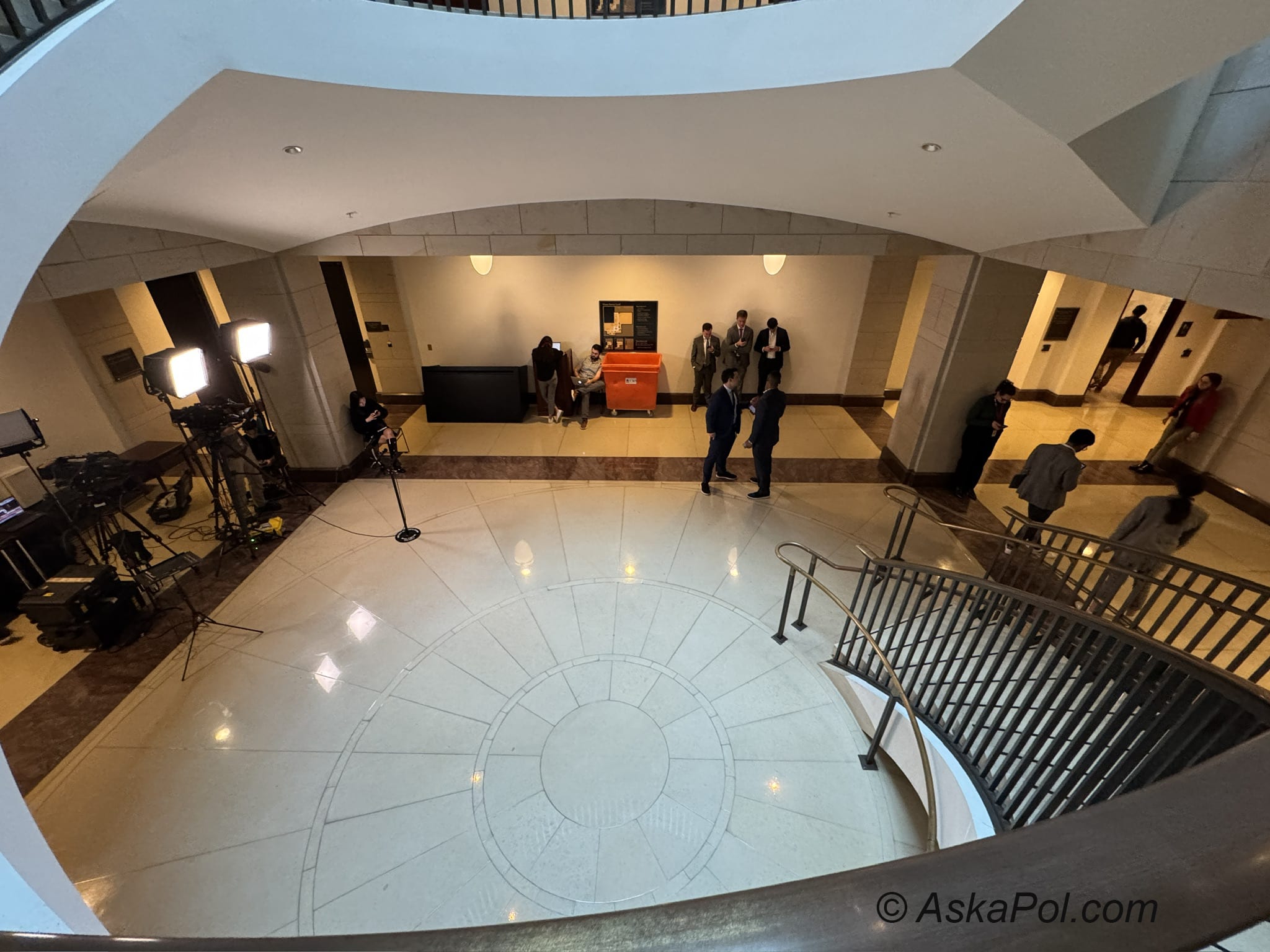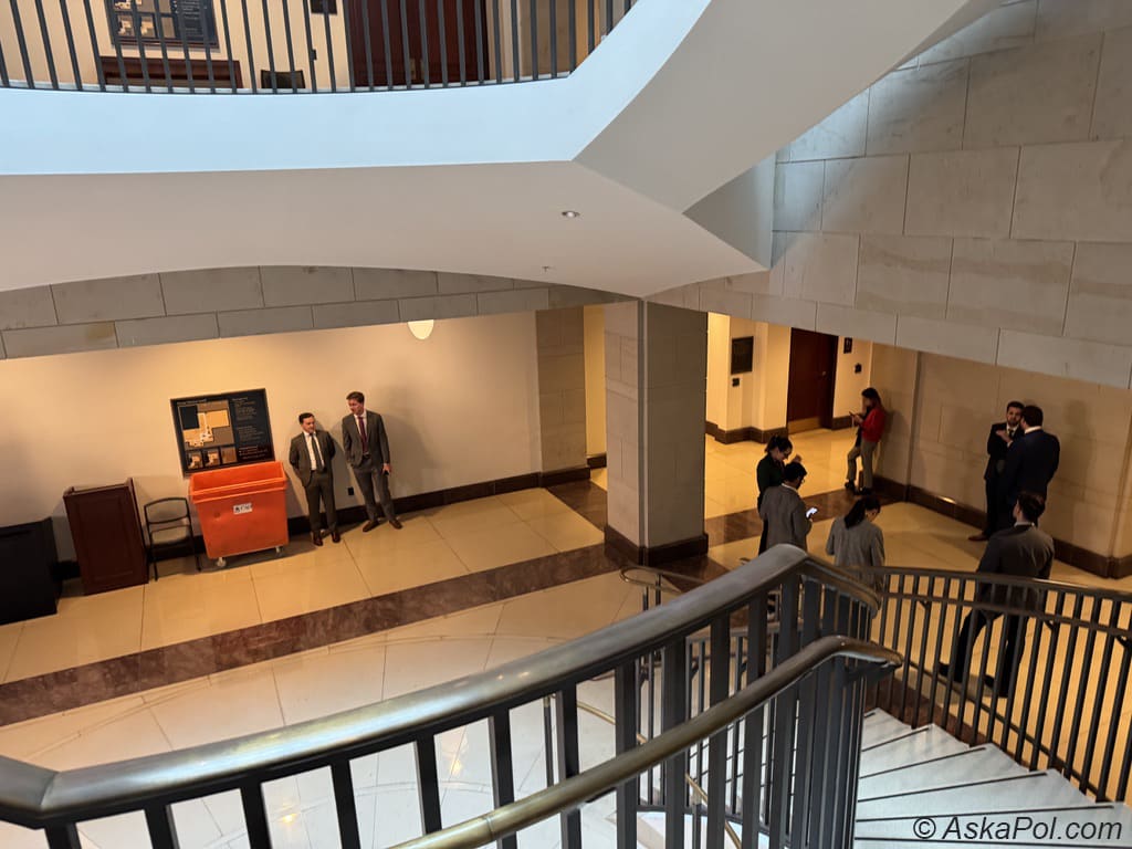 As Gomez exits the SCIF — sensitive compartmented information facility — Ask a Pol woos the Congressman over to his colleagues with cameras.