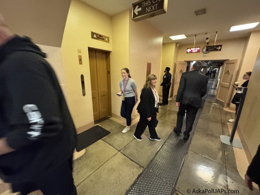 Sen. John Fetterman (black hoodie on left) and Senate Intel Co-chair Mark Warner (suit center) walk in opposite directions in Capitol basement after Warner walked away from Ask a Pol interview (5-21-2025). Photo: Matt Laslo