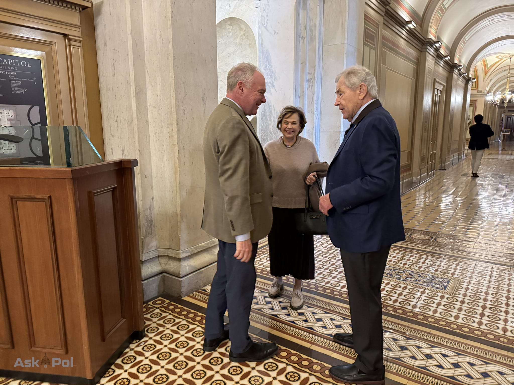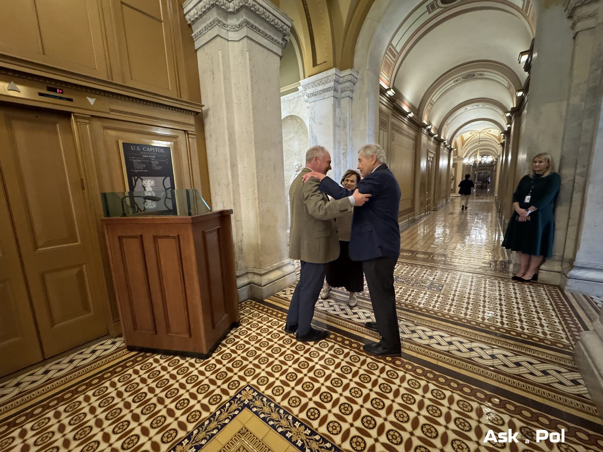 This interview takes place right inside the Senate Carriage Entrance of the US Capitol. Partway through Ask a Pol’s interview, former Secretary of Defense Chuck Hagel and his wife walk past, so Kaine stops to greet them before they head off to the Senators Only dining room for lunch with Sen. Elissa Slotkin (D-MI).