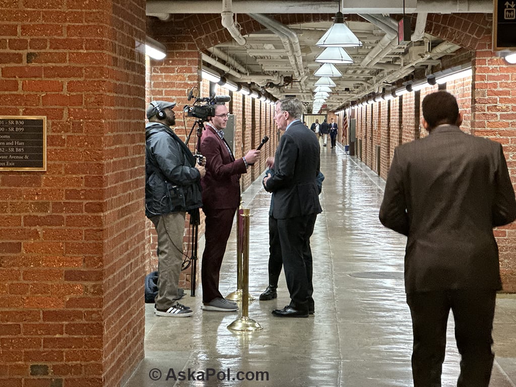SCENE: Ask a Pol’s Matt Laslo’s mic is initially off when Warner approaches him on Wednesday, Nov. 20, asking for a reminder of our questions outside the classified Intel briefing in Senate Hart the previous day.