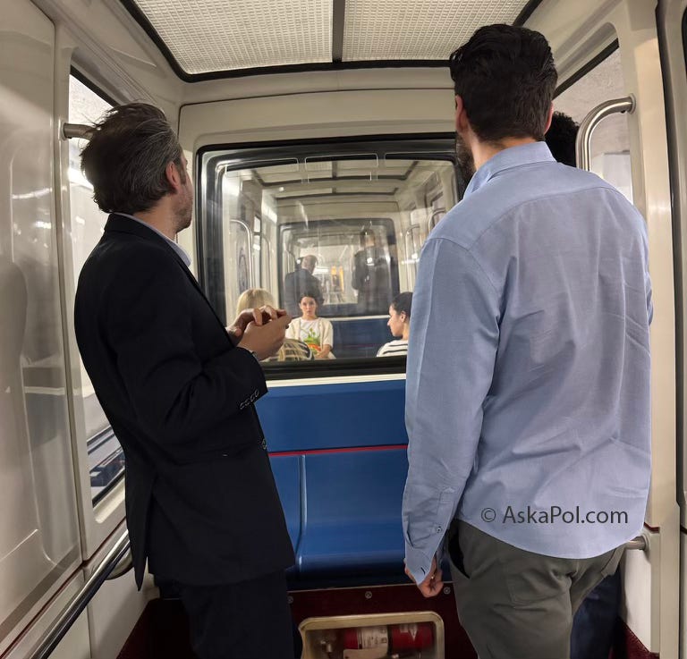 Men look out the front window of stalled tram. Photo: © Ask a Pol